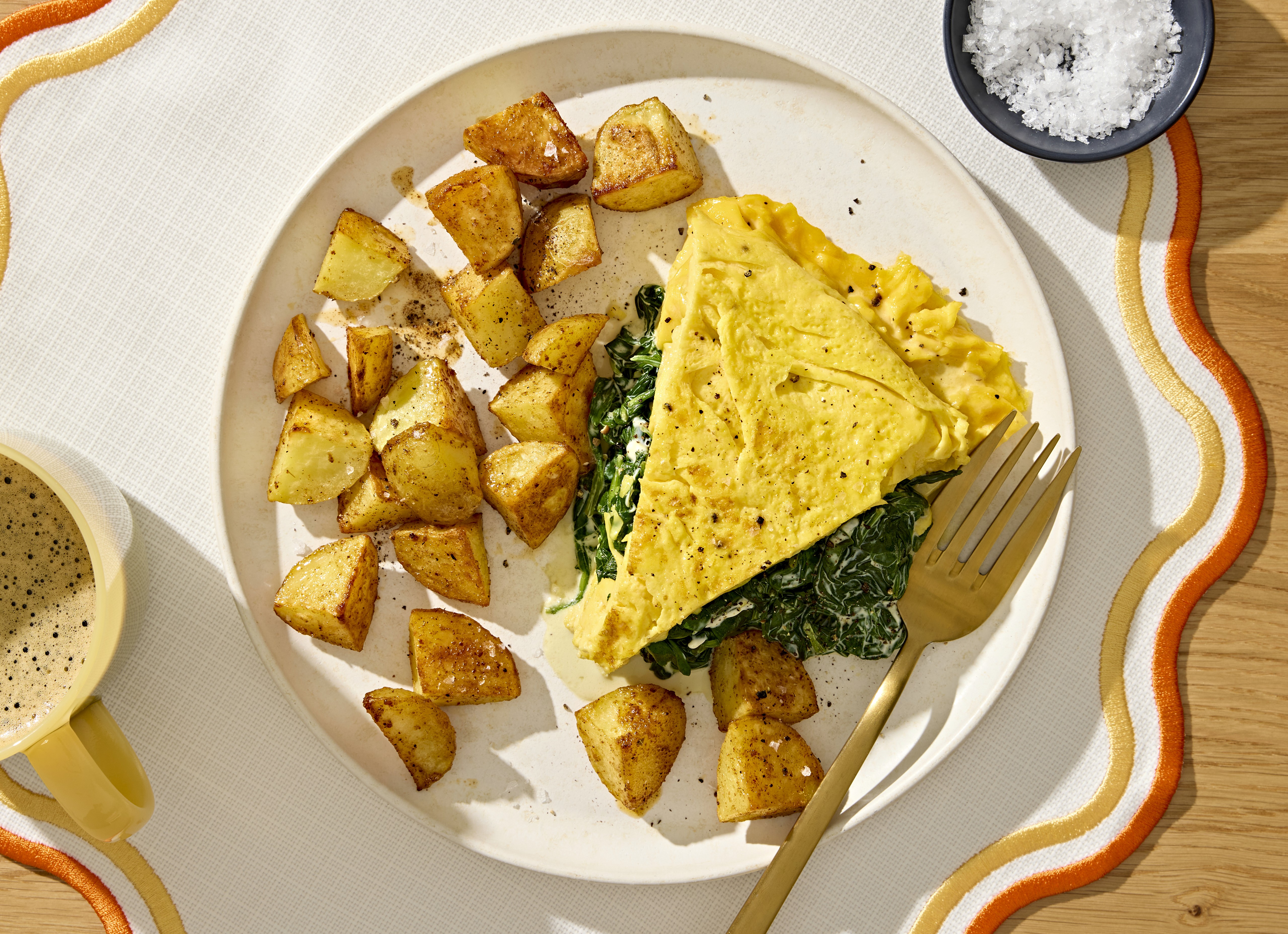 Family-Size Spinach + Herb Cream Cheese Omelet with Home Fries